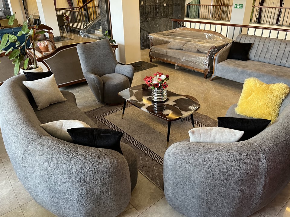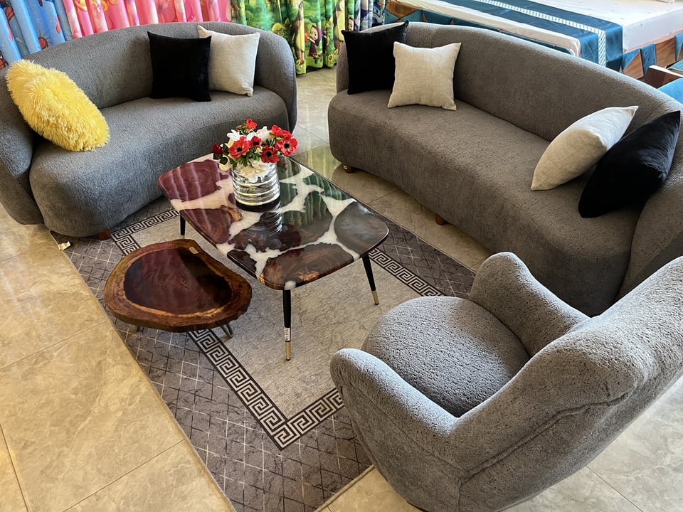 Luxury curved sofa sets in Uganda with two large sofa and one armchair with a center table fluffy cushions and vase