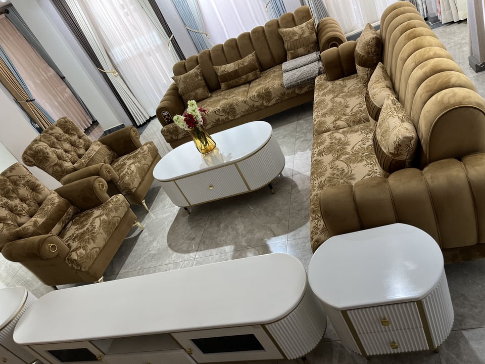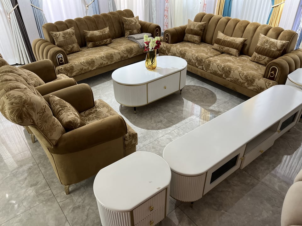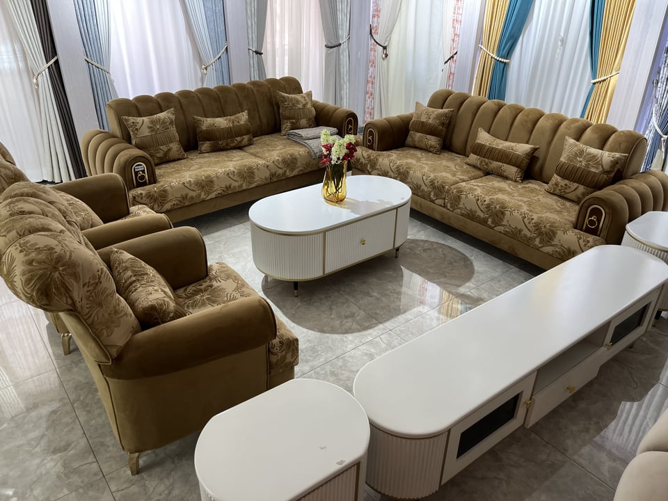 Luxury Sofa Set in Uganda with two large sofas, two armchairs, center table, side tables and a TV stand