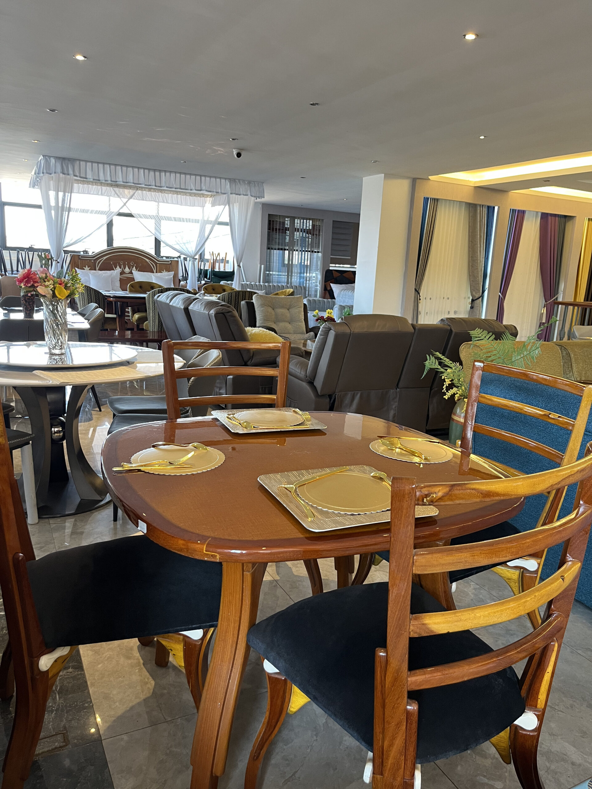 The table is accompanied by four comfortable dining chairs, designed with sturdy wooden frames that complement the table’s aesthetic. Each chair boasts a plush dark-colored fabric seat cushion, ensuring optimal comfort for extended periods of dining and socializing. The simple yet refined design of the chairs integrates seamlessly with a variety of interior styles.